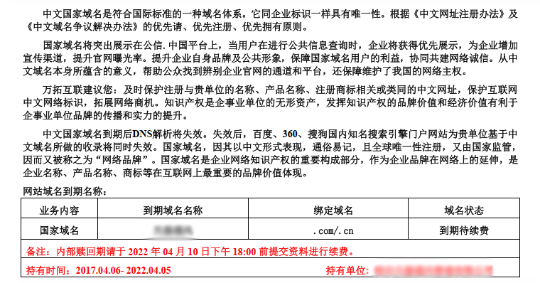 注意:如果您的域名虛擬主機(jī)或者企業(yè)郵箱是在我們這里的,除了我們以外的通知續(xù)費(fèi)都是騙子! 騙子的理由:以域名到期和品牌保護(hù)為由,讓你馬上交錢續(xù)費(fèi),實(shí)際可能這個(gè)域名你本來就沒有注過,或者沒有意義去注。 剛剛,我們的客戶就收到騙子的續(xù)費(fèi)通知,如下圖:切記,有類似的通知請(qǐng)馬上和我們聯(lián)系確認(rèn)!