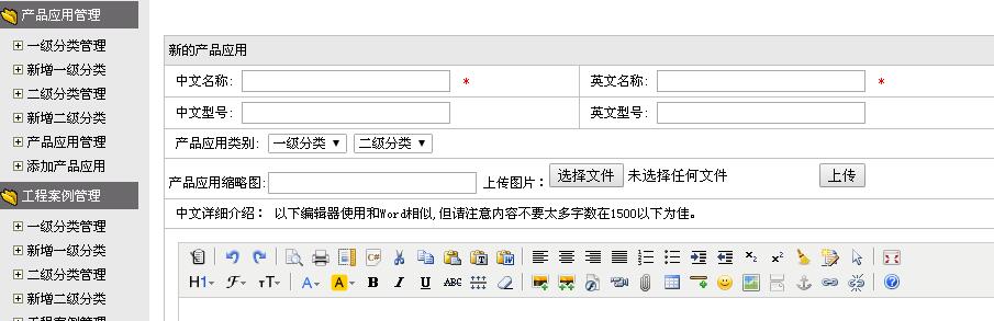 3、產(chǎn)品發(fā)布管理 ,填寫產(chǎn)品中英文名稱,產(chǎn)品中英文型號,上傳產(chǎn)品圖片時(shí)請注意先處理過后再上傳,圖片大小像素寬度控制在600左右,不然影響瀏覽速度和占用網(wǎng)站容量。如下圖: