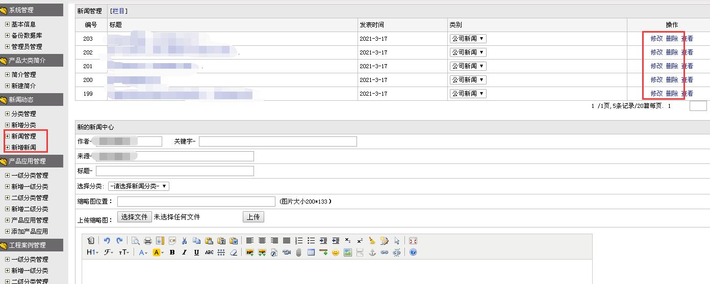 4、新聞發(fā)布系統(tǒng)管理,可發(fā)布、修改、刪除等操作,上傳產(chǎn)品圖片時(shí)請注意先處理過后再上傳,圖片大小像素寬度控制在600左右,如下圖: